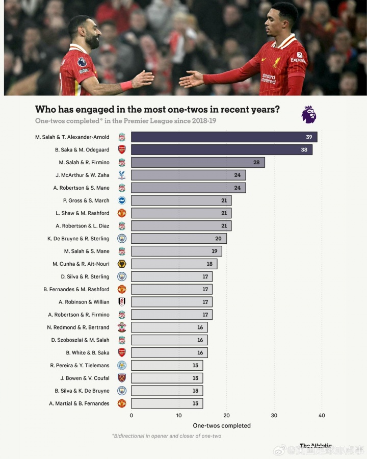 TA统计2018/19赛季以来英超二过一配合次数榜单↓